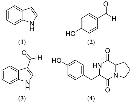 The compounds were identified as indole [25] (1) with the molecular formula C8H7N, 4-hydroxybenzaldehyde [26] (2) with C7H6O2, 1H-indole-3-carboxaldehyde [27,28] (3) with C9H7NO, and (3S,8aS)-3-[(4-hydroxyphenyl)methyl]-2,3,6,7,8,8a-hexahydropyrrolo[1,2-a]pyrazine-1,4-dione (Cyclo (-Pro-Tyr)) [29] (4) with C14H16N2O3. Compounds 1–4 are reported for first time from this strain. NMR spectra are available in Supplementary Material.