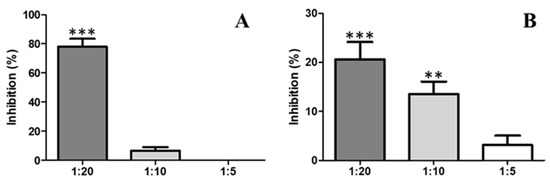 Inhibition of the proteolytic activity of B. asper venom (A) and a metalloproteinase (B) by indole. A dose of 3 µg of venom or toxin per well was used. *** = p value < 0.001, ** = p value < 0.01 with respect to positive control.