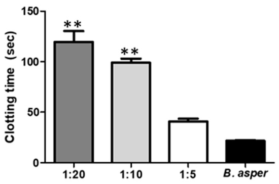 The method described by Theakston and Reid [62] was followed, with small modifications. Briefly, 1.0 µg of B. asper dissolved in 25 µL PBS were mixed with 75 µL of different concentrations of indole, and pre-incubated for 30 min at 37 °C. After, 100 µL of mixtures were added to 0.2 mL of plasma, and the time required for plasma coagulation was determined.