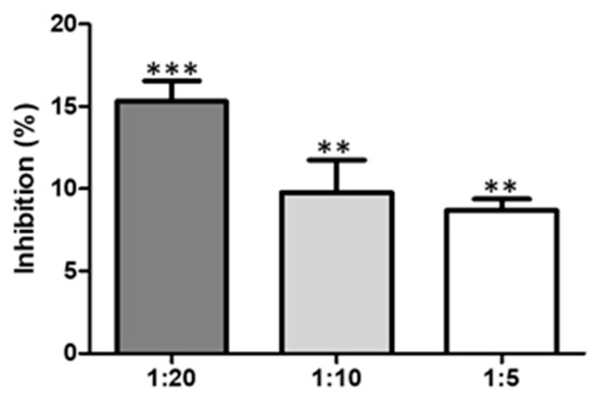 To evaluate the activity of PLA2, two different techniques were applied: Indirect hemolytic activity and the use of 4-nitro-3-octanoyloxybenzoic acid (4N3OBA) as monodispersed substrate. A low degree of inhibition against PLA2 activity by indole was observed (Figure 5). The toxin:compound ratio of 1:20 showed proteolytic activity inhibition of 15.20%; while a ratio of 1:10 showed proteolytic activity inhibition of 10.0%. These differences were not statistically significant between the evaluated ratios, but they were significant with respect to the positive control (Figure 5). Indole did not show inhibition of the indirect hemolytic activity of the complete venom of B. asper at tested doses.