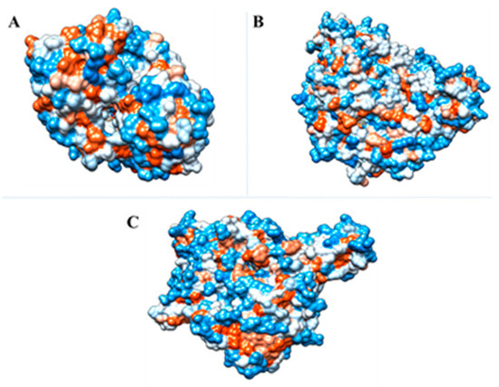 Binding of ligands to active site of studied enzymes. (A) Indole + AChE (B) Indole + AG (C) 1H-indole-3-carboxaldehyde + XO. The red areas of the surface represent the acid regions; the white areas represent the neutral and the blue areas the basic regions.