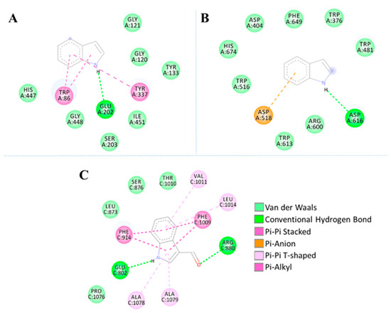 Molecular docking. (A) Indole with active site residues of AChE (B) Indole with active site residues of AChE (C) 1H-indole-3-carboxaldehyde with active site residues of XO.