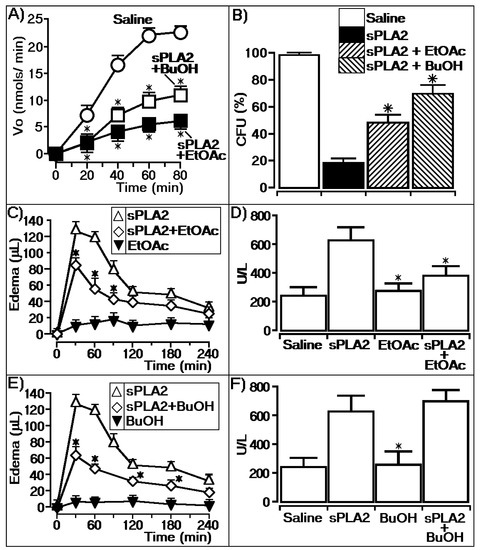 Laguncularia racemosa extracts and the enzymatic and pharmacological activities of secretory phospholipase A2 (sPLA2). (A) Activity of the buthanolic (BuOH) and ethyl acetate (EtOAc) phases on phospholipase A2 enzymatic activity, where saline represents the control group, BuOH represents sPLA2 treated with the buthanolic partition, and EtOAc represents sPLA2 treated with the ethyl acetate partition. The results are expressed as a variation of enzymatic velocity Vo, and the error bars indicate the SEM. * Statistically significant differences (n = 5, p < 0.05) compared to native sPLA2. (B) Effect of native sPLA2 and the proteins treated with the BuOH and EtOAc partitions against Clavibacter michiganensis pv. michiganensis (gram-positive bacteria). The error bars indicate the SEM of n = 6. * p < 0.05 compared with the saline control. (C,E) show paw edema induced after the injection of sPLA2 and sPLA2 treated with EtOAc and BuOH, respectively, into the right paws of Swiss mice. Edema is expressed as volume in µL and measurements were performed after 30, 60, 120, 180, and 240 min. The error bars indicate the SEM of five experiments. * p < 0.05 compared to native sPLA2. (D,F) show the myonecrosis assay and the results are expressed as creatine kinase (CK) units of enzymatic activity per liter (U/L). The error bars indicate the SEM of five experiments. * p < 0.05 compared with native sPLA2.