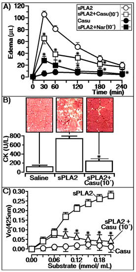(A) Shows the protective effect of Casu injected into animals 10 min before the injection of native sPLA2 and edema induced by Casu alone. In (A), we also show the protective effect of naringenin (Nar) administered under the same conditions as Casu. This compound was used as an anti-inflammatory effect control. (B) Reveals the protective effective of Casu injected in the same manner as shown in (A). This figure shows that Casu injected 10 min after sPLA2 application neutralizes the myotoxic effects induced by sPLA2 once the CK levels decrease, revealing a histological similarity with saline. (C) Exhibits an irreversible profile of Casu, in which the enzymatic activity of sPLA2 is diminished in a dose-dependent manner.