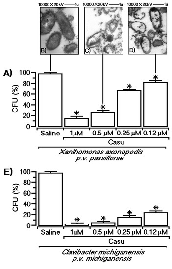 Antimicrobial effects of Casu against gram-positive and gram-negative phytobacteria. In both cases, antimicrobial effects occurred in a dose-dependent manner. The effect of Casu is shown against Xanthomonas axonopodis pv. passiflorae (A) and C. michiganensis pv. Michiganensis (E). Electron microscopy images show that Casu induces a massive membrane rupture, leading to a decrease in bacterial survival, in a dose dependent manner, as shown in (B–D). One-way ANOVA with Dunnett’s test was used, and values of p < 0.05 were considered significant as indicated by asterisk.