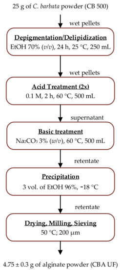 The extraction method (Figure 1) that was employed for the extraction of alginate had a yield of 19 ± 1.5% (w/w) and relative to the algae dry matter estimated at 95 ± 2%. This method is presented in detail in Section 3.2. The final alginate product is obtained as a fine powder (under 0.2 mm), which is referred to as CBA UF.
