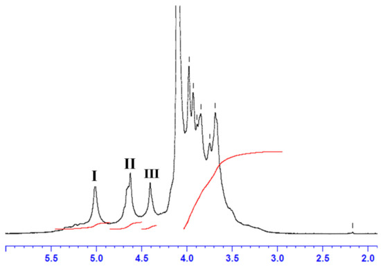As well defined in the literature [69,70], 1H-NMR analysis identifies the alginate structure with three signals in the anomeric region: Signal I corresponds to the anomeric proton of the guluronic acid residue (G-1), Signal II corresponds to the overlap between the mannuronic acid anomeric proton (M-1) and the H-5 of alternating blocks (GM-5), and Signal III corresponds to proton H-5 guluronic acid from the GG-5G block (G-5). As a general rule, by using the NMR method we could estimate the proportions of each individual block of guluronic and mannuronic acids (FG and FM), the homogeneous (FGG and FMM) and heterogeneous (FGM and FMG) blocks of alginate [70] extracted from C. barbata (CBA UF) using the areas (A) of signals I, II and III and the Equations (1), (2) and (3):