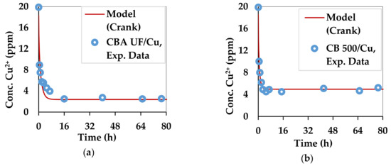 The diffusion equation represented by Equation (9) [76] was used to simulate the experimental results of adsorption of Pb2+ and Cu2+ and is based on the diffusion of ions from a solution at a given ion concentration until the solution is solid free or has a constant negligible concentration of ions, which is the case of the present study. α in Equations (9) and (10) represents the ratio between the volume of the liquid and the volume of the solid. In the case of the alginate beads, the volume of solid is represented by the total volume of the beads used. When algal powder is used, the volume of the solute can be approximated by the equivalent volume of water and powder, which is taken up by the powder when swelling. This value is 4.14 times greater than the mass of the used powder. The ratio of a sphere equivalent in volume to the substrate needs to be found for both the alginate and the powder. This term is named a. The effective diffusivity of the solute in the solid is termed Deff (m2/s). qn represents the six non-zero roots of Equation 10. qe represents the equilibrium value of the adsorption while qt is the value of the ion adsorption at time t.
