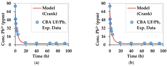 The values of Deff in all cases are similar to the self-diffusivity of Cu2+ and Pb2+ in water: 0.71 × 10−9 m2/s and 0.95 × 10−9 m2/s [77]. This can be explained by the high content of water in the beads and the swollen biomass. Alginate gels are generally nanoporous [6,78], leading to high diffusion rates of small solutes [6]. However, in this case Deff is accelerated by the affinity of divalent metal ions towards the egg-box structure of gels [39] formed by the G fractions in the alginate structure. The Ca2+ ions, which occupy this site initially, are replaced by the Pb2+ and Cu2+ ions, which have a higher affinity [40]. The qe is the maximum adsorption capacity in the given setup, which was not meant to saturate the substrate. The diffusivities obtained for the substrates used in this work are higher than those obtained for materials used in a similar work for Pb2+ and Cu2+ [79].