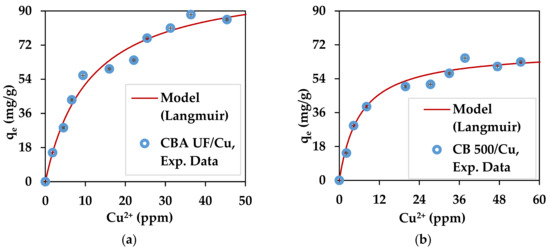 On the same figures, the Langmuir adsorption model is shown for optimized parameters: qmax and KL. This model has been used in many studies that involve the adsorption of pollutants such as heavy metals, dyes and phenol [24,82,83]. This model is represented by Equation (11). Ce represents the concentration of metal ions still in the solution.