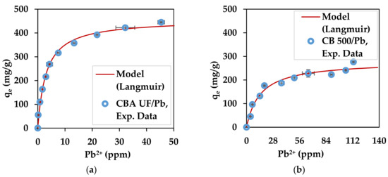 The experimental values for the maximum sorption capacities deduced from the adsorption isotherms are represented in Figure 5 and Figure 6 and are presented in Table 4. Such levels of Pb2+ concentration are in the range of contaminated mine waters [80,81].