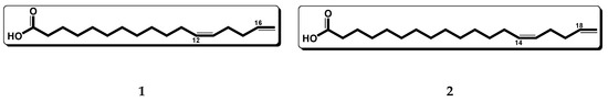 In this study, a total of 65 different FAs, along with diverse NMI di-, tri-, and tetraenoic FAs, which we have identified previously, were detected in ovaries of C. toreuma, except for some minor FAs (less than 0.1% of the total FAs). Among the identified FAs, 16:0, 18:1n-9, 18:1n-11, 20:4n-6, and 20:5n-3 were major components, whereas 20:4n-6 and 20:5n-3 (more than 15% of the total FAs) were present in polar lipids [9]. Among the previously undescribed minor FAs, 1 and 2 (Figure 1) from triacylglycerols (TAG) and polar lipids were fractionated by using 5% (w/v) argentation thin-layer chromatography (TLC), however, they were not isolated due to their minute quantity. Despite their minute amounts, 1 and 2 in TAG and polar lipids were detected by gas chromatography-mass spectrometry (GC-MS).