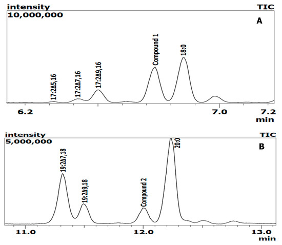 Partial GC-MS total ion current chromatograms of the methyl esters of the dienoic FAs with 1 (A) and 2 (B) fractionated by using 5% (w/v) argentation TLC, from TAG in ovaries of C. toreuma. To determine the elution order of the methyl esters of 1 and 2, authentic methyl octadecanoate (18:0) and methyl eicosanoate (20:0), as saturated straight-chain FA methyl ester markers, were added into this fraction.