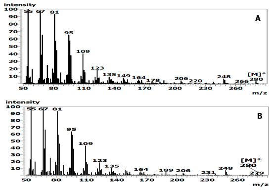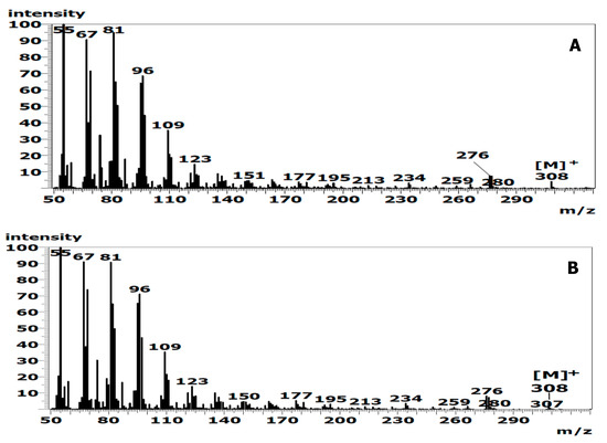 EI-MS spectra of the 3-pyridylcarbinol derivatives of naturally occurring 2 (A) and 2 obtained by synthesis (B).