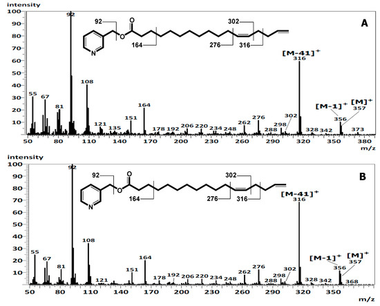 Synthetic 1: EI-MS spectrum for methyl 12,16-heptadecadienoate: 280 ([M]+, 4), 248 ([M − 32]+, 7), 220 (1), 206 ([M − 74]+, 4), 178 (2), 164 (5), 149 (8), 123 (18), 109 (43), 95 (64), 81 (93), 74 (25), 67 (99) and 55 (100); ECL 17.93; EI-MS spectrum for 3-pyridylcarbinyl 12,16-heptadecadienoate: 357 ([M]+, 9), 356 ([M − 1]+, 12), 342 ([M − 15]+, 1), 328 ([M − 29]+, 2), 316 ([M − 41]+, 69), 302 (2), 276 (12), 262 (8), 248 (2), 234 (3), 220 (5), 206 (4), 192 (2), 178 (3), 164 (20), 151 (10), 108 (34) and 92 (100), (Figure 3B and Figure 5B).