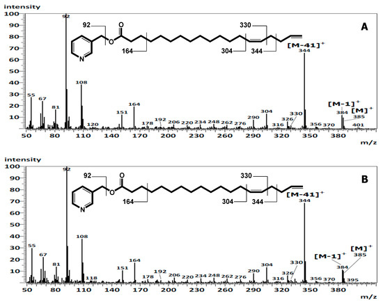 Synthetic 2: EI-MS spectrum for methyl 14,18-nonadecadienoate: 308 ([M]+, 4), 276 ([M − 32]+, 7), 248 (1), 234 ([M − 74]+, 4), 177 (5), 163 (5), 150 (5), 123 (14), 109 (35), 96 (71), 81 (91), 74 (30), 67 (91), 55 (100); ECL 19.93; EI-MS spectrum for 3-pyridylcarbinyl 14,18-nonadecadienoate: 385 ([M]+, 10), 384 ([M − 1]+, 11), 370 ([M − 15]+, 1), 356 ([M − 29]+, 1.4), 344 ([M − 41]+, 69), 330 (2), 304 (13), 290 (8), 276 (3), 262 (3), 248 (4), 234 (4), 220 (3), 206 (4), 192 (2), 178 (3), 164 (17), 151 (10), 108 (38) and 92 (100), (Figure 4B and Figure 6B).