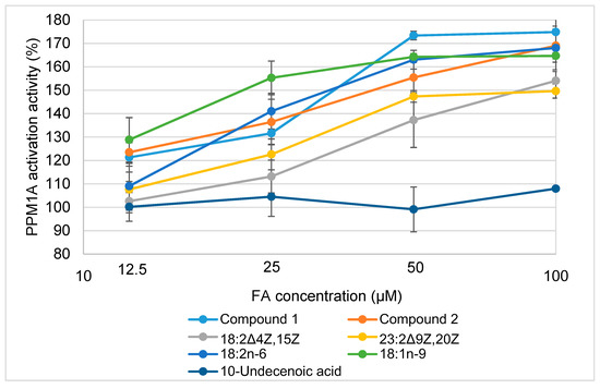 PPM1A activation activity of 1 and 2, obtained by synthesis, and the structurally related FAs. The experiment was performed in triplicate. All values are the mean ± standard deviation. NMI FAs 18:2Δ4Z,15Z and 23:2Δ9Z,20Z were chemically synthesized as described previously [11]. Both 18:1n-9 and 18:2n-6 were purchased from FUJIFILM Wako Pure Chemical Co. (Osaka, Japan) and 10-undecenoic acid was purchased from Funakoshi Co., Ltd. (Tokyo, Japan).