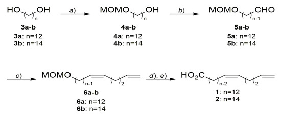 The total synthesis of 1 and 2 started with commercially available diols 3a and 3b, respectively. Monoprotection of 3a and 3b, with chloromethyl methyl ether (MOMCl), provided the mono-MOM ethers 4a and 4b, which were converted to the aldehydes 5a and 5b by pyridinium chlorochromate (PCC) oxidation. The Wittig reaction of 5a and 5b with the Wittig reagent under salt-free conditions [23] provided the dienes 6a and 6b in 84% and 94% yield, respectively. Deprotection of the MOM protecting group in 6a and 6b, followed the Jones oxidation of the resulting alcohols, gave rise to 1 and 2 (Scheme 1).