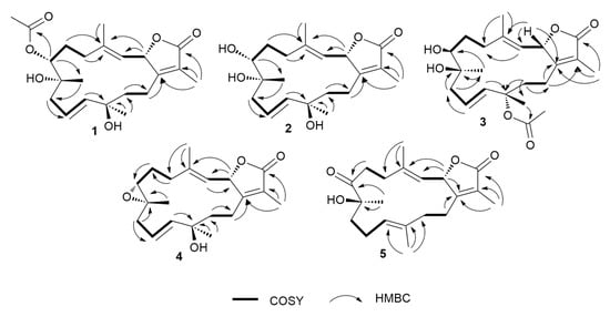 1H-1H COSY and key HMBC correlations of compounds 1–5.
