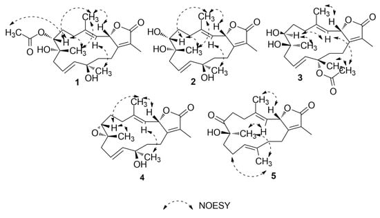 The molecular formula of compound 2 was determined to be the same as that of sinumaximol G (6) (C20H30O5); m/z 351.2160 [M + H]+ ion (calcd m/z 351.2166) (Figure S10). The one-dimensional (1D) and two-dimensional (2D) NMR spectroscopic features (Table 1 and Table 2; Figures S11–S15) also indicated that 2 had an almost identical structure as 1 and sinumaximol G (6) [16]. The difference between those two compounds was the deshielding of the H3-19 methyl protons (δH 1.34), which indicated that the configuration of the methyl group at C-8 is altered to the β-configuration. The 1H-1H NOESY correlation (Figure 3) between H3-19 (δH 1.34) and H3-18 (δH 1.83) further confirmed this change, and hence compound 2 was identified as a new natural product, which we named 8-epi- sinumaximol G (2).