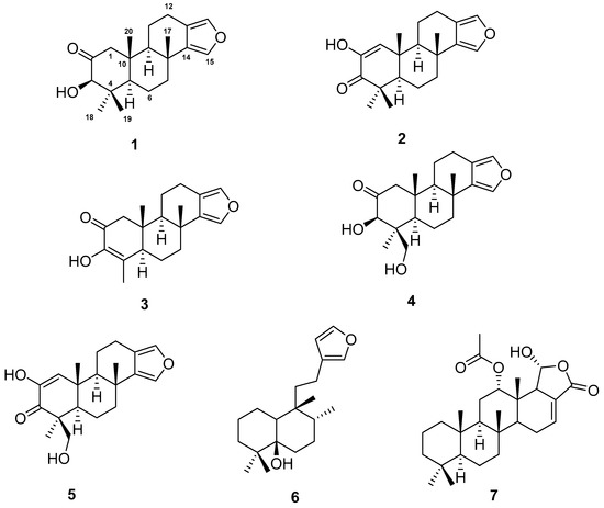 - Searle, P.A.; Molinski, T.F. Scalemic 12-hydroxyambliofuran and 12-acetoxy-ambliofuran, five tetracyclic furanoditerpenes and a furanosesterterpene from Spongia sp. Tetrahedron 1994, 50, 9893–9908. [Google Scholar] [CrossRef]