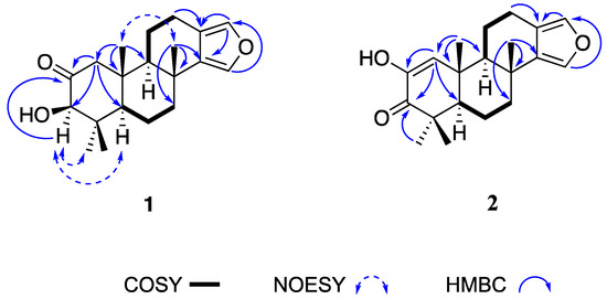Key 1H-1H COSY, NOESY, and HMBC correlations of 1 and 2.
