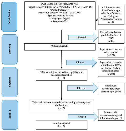 The keywords used in the search of the selected electronic databases included the following: “Chitosan AND (Dentistry OR “Oral Health” OR “Dental Material”).