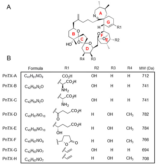 PnTXs are characterized by a central invariable backbone with four external substituents R1 to R4 (Figure 1A). This central backbone is an amphoteric macrocyclic structure composed of several rings of type 6,7-spiro (A and G rings), 5,6-bicyclo (bridged E and F rings), or acetal 6,5,6-trispiro (B, C and D rings) [10]. Their molecular weight is about 700 g.mol−1 (Figure 1B). The metabolism of PnTXs and PtTXs in shellfish was investigated from environmental samples collected at Franklin Harbor, Australia, with structural toxin elucidation by NMR [8]. PnTX-B, -C, and -D and PtTX-A, -B, and -C were suggested as metabolites of PnTX-E, -F, and -G.