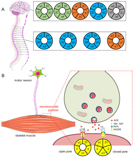 PnTXs act as competitive antagonists of nicotinic acetylcholine receptors (nAChRs). (A) Central (upper) and peripheral (lower) nAChRs, as a function of their subunit composition. Some nAChRs are exclusively present in the CNS or in the PNS, for instance the ganglia of the autonomous system. Others, like α7 homopentamers or α3β2 heteropentamers, are expressed in both. Note that only a few of the existing nAChRs are represented (α7β2, α4β2 for example are not presented, see [19,20]). (B) Mode of action of PnTXs at the neuromuscular junction. The toxins bind to the sites where it normally binds on the nAChR expressed at the surface of the endplate muscle membrane, thus impairing the opening of the cationic pore. When the receptor is inhibited, it cannot promote the depolarization of the endplate membrane, which impairs the generation of a muscle action potential and thereby the initiation of muscle contraction.