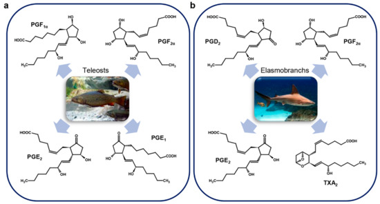 Marine vertebrate prostaglandins. (a) Teleosts (Salmo sp., Paralichthys olivaceus, Oncorhynchus keta, Thunnus thynnus, Salvelinus fontinalis, Pleuronectes platessa, Opsanus tau); (b) Elasmobranchs (Triakis scyllia, Scyliorhinus canicula). Pictures show organisms that are only representatives of each class. For details, refer to the text.