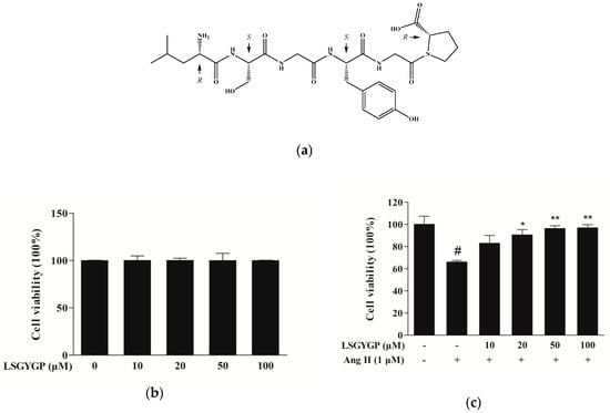 (a) Structure of Leu-Ser-Gly-Tyr-Gly-Pro (LSGYGP). Effect of LSGYGP on the viability of human umbilical vein endothelial cells (HUVEC). (b) and protective effect of LSGYGP on the viability of Ang II-treated HUVEC. (c) Cells were exposed to varying concentrations (10, 20, 50, and 100 μM) of LSGYGP and the cell viability was assessed by MTT assay. # p < 0.001, compared with blank group (untreated cells); * p < 0.05, ** p < 0.01, compared with control group (Ang II-treated cells).