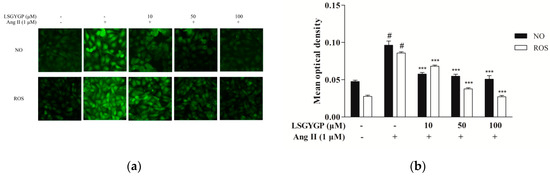 As Figure 2a shows, the Ang II group had an obvious effect on NO and ROS levels, as compared to the untreated control. Remarkably, 10 μM treatment with LSGYGP decreased the Ang II-induced increase in NO and ROS generation. LSGYGP significantly attenuates NO and ROS production in a dose-dependent manner.