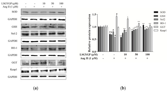 Effects of LSGYGP on the expression of superoxide dismutase (SOD), gamma-glutamyltransferase (GGT), glutathione (GSH), and nuclear erythroid 2-related factor 2 (Nrf2) pathway in HUVEC (a,b). Protein expression was by western blot, glyceraldehyde-3-phosphate dehydrogenase (GAPDH) was as control. # p < 0.001, compared with blank group (untreated cells); * p < 0.05, *** p < 0.001, compared with control group (Ang II-treated cells).