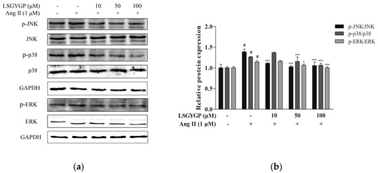 Western blot was used to detect phosphorylation of JNK, ERK, and p38. Moreover, Ang II markedly increased protein expression of phosphorylated p38, JNK, and ERK, as compared to the non-Ang II-treated control. However, the above changes were both markedly reversed by 100 μM treatment with LSGYGP (Figure 4b). The above results indicate that, while Ang II markedly activates endothelial oxidative stress, LSGYGP treatment may attenuate this oxidative damage through MAPK pathways.