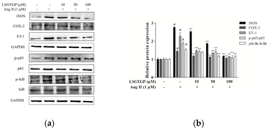 As LSGYGP could down-regulate NO production (as per the above summarized results), western blot was used to analyze whether LSGYGP decreased NO expression through iNOS down-regulation (Figure 5a). As shown in Figure 5b, the reduction level of iNOS was consistent with the result of NO production measured in LSGYGP treatment. Furthermore, COX-2 and ET-1 levels were also investigated. As depicted in Figure 5b, expression of COX-2 and ET-1 mainly increased after exposure to Ang II, but treatment of 10 μM LSGYGP markedly blocked the Ang II induced changes. Moreover, the results revealed that LSGYGP may inhibit expression and translocation of NF-κB p65 by suppressing the phosphorylation of IκBα.