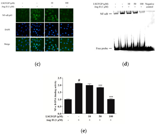 Immunocytochemistry and electrophoretic mobility shift assay (EMSA) were applied to further investigate the translocation of NF-κB p65 in Ang II-stimulated HUVEC. Observing images in Figure 5c, the NF-κB p65 sub-unit was transported to the nucleus after Ang II stimulation, as indicated by the NF-κB p65 protein level in the western blot test. Employing image analysis, treatment with Ang II presented a significant increase in the DNA-binding activity of NF-κB, whereas treatment with LSGYGP significantly reduced the Ang II-induced DNA-binding activity of NF-κB (Figure 5d,e), this revealed that p65 might enter the nucleus based on DNA-binding activity.