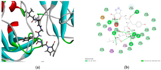 Molecular docking results revealed that LSGYGP connected with NF-κB in a steady interaction (Figure 8a). The CDOCKER results of the NF-κB–LSGYGP combination can evaluate the rationality of side-chain backbone interactions (−5.557 kcal/mol), which is shown at 2.0 Å resolution in Figure 8b (as can be seen, the first way is the best). LSGYGP generated 10 hydrogen bonds, with bond lengths of 5.42 Å, 6.41 Å, 4.83 Å, 5.35 Å, 4.74 Å, 4.61 Å, 3.57 Å, 5.24 Å, 5.81 Å, and 5.46 Å with Lys79, Lys79, Gln220, Gln29, Gln29, Met279, Glu282, Lys221, Lys221, and Lys221, respectively, in Table 1.
