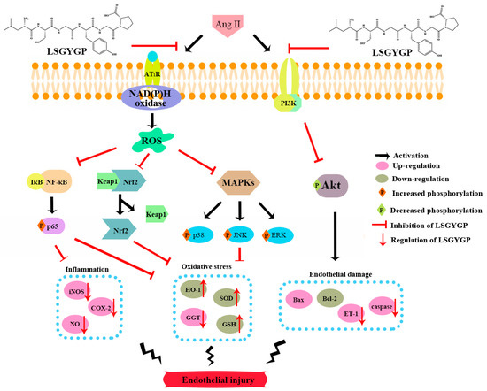 This study has firstly reported that LSGYGP acts in a cytoprotective role against Ang II-induced oxidative stress and inflammation. LSGYGP altered the related protein expressions of the NF-κB/Nrf2 signaling pathways and reversed Ang II-induced cell endothelial injury for the first time. The entire signaling pathway of this study is shown in Figure 9. Considering all of the results, we may conclude that LSGYGP effectively attenuated Ang II-stimulated cellular injury by activation of the NF-κB/Nrf2/MAPK/Akt pathways, at both the cellular and molecular levels. This study has also illustrated that Ang II, through oxidative stress, inflammation, and apoptosis pathways, could contribute to injury events in endothelial dysfunction, especially in terms of hypertension and atherosclerosis, but future studies are still necessary to determine the specific receptors involved. Future research should further discuss and confirm that how Ang II to binds the angiotensin type 1-receptor (AT1R) and activates membrane-bound NAD(P)H oxidase for the formation of ROS; how oligopeptide LSGYGP to binds with AT1R through determinate the location for GABARAP. Besides, bioavailability and transport mechanisms of oligopeptide are remains to research for following bioactivity design and application of peptide drugs, these are the key concerns attempted to overcome by using different design strategies in the future.