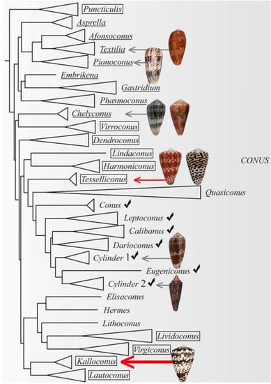 - Puillandre, N.; Bouchet, P.; Duda Jr, T.F.; Kauferstein, S.; Kohn, A.J.; Olivera, B.M.; Watkins, M.; Meyer, C. Molecular phylogeny and evolution of the cone snails (Gastropoda conoidea). Mol. Phylogenet. Evol. 2014, 78, 290–303. [Google Scholar] [CrossRef] [PubMed]