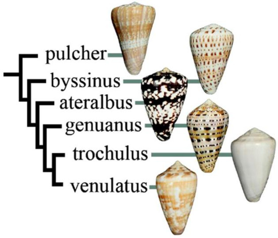 - Cunha, R.L.; Castilho, R.; Ruber, L.; Zardoya, R. Patterns of cladogenesis in the venomous marine gastropod genus Conus from the Cape Verde islands. Syst. Biol. 2005, 54, 634–650. [Google Scholar] [CrossRef] [PubMed]