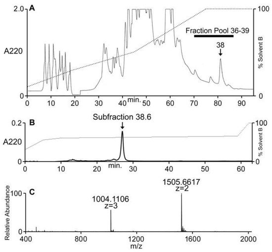 Fractionation of Conus ateralbus venom. The peptide characterized in this study was first detected in the pool of fractions shown, 36–39 (A). Further purification of the active fraction (fraction 38) yielded the chromatogram shown in (B). The major peak (subfraction 38.6) was both biologically active (Figure 5) and gave the results shown in (C) upon analysis on an Orbitrap Elite mass spectrometer at 120,000 resolution.