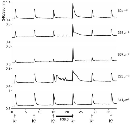 Responses of five different cells to native AtVIA (subfraction 38.6). Shown are the responses of five dorsal root ganglion (DRG) neurons (see Methods); the size of each cell is indicated. A pulse of 25 mM KCl was applied as described under Methods; the horizontal bar indicates when cells were incubated with the purified peptide. The first three cells (from top) show a change in response upon depolarization with KCl. The fourth trace shows a cell that directly increased cytosolic Ca++ when the peptide was added, even without KCl depolarization (approximately 26% of neurons responded in this manner) and the bottom trace shows a cell that did not respond (approximately 15% of DRG neurons were non-responsive to the peptide).