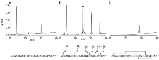 The δ-conotoxin family is known to be difficult to synthesize and correctly fold due to their highly hydrophobic character [13,16]. While some of them are relatively easy to handle in linear form (e.g., PVIA), others are not; AtVIA[I25L;V28L;T30S], which was the peptide identified from the early sequencing results, is a good example of such behavior. When suspended in HPLC solvent with high acetonitrile content (>50%) and injected on the C18 column, no peptide peak was observed (Figure 7, Panel A). However, with methane thiosulfonate bromide (MTSET) treatment for 1 h 30 min, a major product appeared (Figure 7, Panel B). Its identity was confirmed by mass spectrometry. Methanethiosulfonate reagents (MTS-R) are known to rapidly and selectively react with cysteine residues forming mixed disulfides [17]. Thus, all 6 cysteines of AtVIA[I25L;V28L;T30S] were modified with thiocholine residues, thereby increasing overall solubility of the peptide, and making it easy to purify by reversed-phase high performance liquid chromatography (RP-HPLC). Such mixed disulfides are reversible and do not interfere with the subsequent oxidative folding reaction, which was shown before [18] for the synthesis and folding of hepcidin via S-sulfonation. Linear AtVIA[I25L;V28L;T30S] with thiocholine-modified cysteine residues folded within 4 h in a buffered solution (pH = 8.7), in the presence of 5% Tween 40 and 1:1 mixture of reduced and oxidized gluthatione with 14% yield (Figure 7, Panel C). The temporary peptide modification with MTS-R reagent can be a useful method for improving the solubility of highly hydrophobic conopeptides, in addition to already existing methods, including recently published approach utilizing an acid-cleavable solubility tag [19].