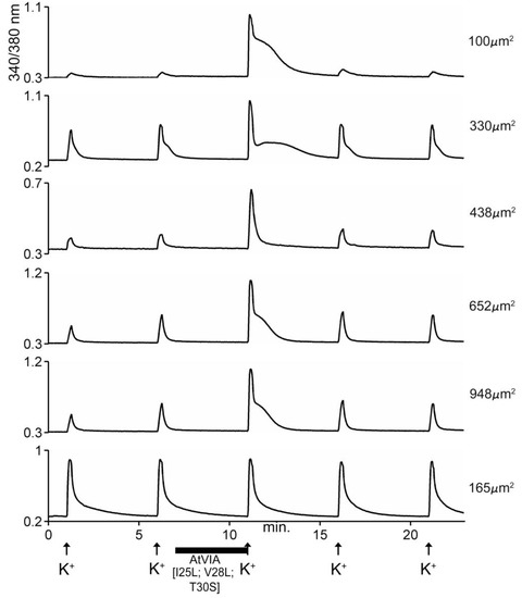 The data obtained by calcium imaging in native DRG neurons in the presence of the AtVIA analog is shown in Figure 8. There is no apparent difference between the indirect effects of the native sample of AtVIA (Figure 5) and that of AtVIA[I25L;V28L;T30S]. However, the direct effects observed on the addition of the native sample of AtVIA were not observed with AtVIA[I25L;V28L;T30S]. These direct effects (Figure 5, 4th trace from the top) could be attributed to the presence of a trace of impurity in the native sample; on the other hand, the absence of these direct effects in the presence of the synthetic sample could also be attributed to any of the substitutions made on the amino acid sequence of native AtVIA.