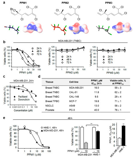 PPM1, but not PPM2 or PPM3, is selectively cytotoxic to breast cancer cells. (a) Structures and three-dimensional electrostatic potential models of compounds PPM1, PPM2, and PPM3. The negatively charged regions are red and the positively charged regions are blue. PPM1 (violet carbon sticks), PPM2 (orange carbon sticks), and PPM3 (grey carbon sticks) (bromine, red; chlorine, light green; hydrogen atoms omitted for clarity). (b) MDA-MB-231 cells were treated with the marine-derived synthetic polyhalogenated monoterpene analogues for the indicated times. Cell viability was analyzed by a XTT cell viability assay. (c) MDA-MB-231 cells were treated with different concentrations of doxorubicin or paclitaxel for 24 h and analyzed as in (b). (d) Different cancer cell lines were treated with PPM1 for 24 h and analyzed as in (b). NSCLC, non-small cell lung cancer; PPM110 shows number of viable cells after treatment with 10 µM PPM1 for 24 h. (e) Normal human primary mammary epithelial HME-1 cells are relatively resistant to PPM1. Cells were treated for 48 h and analyzed as in (b). Statistical analysis was performed by using the Newman-Keuls test. Data are mean ± SEM, n = 3, ** p < 0.01. All data are mean ± SEM, n = 3.