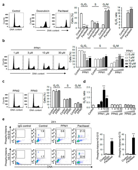 Based on the differential cytotoxic potential of PPM1 towards the malignant MDA-MB-231 cells compared to normal human mammary epithelial cells, we next addressed the molecular mechanism of PPM1 cytotoxicity in comparison to standard chemotherapeutic agents. Doxorubicin- or paclitaxel-treated MDA-MB-231 cells exhibited a pronounced accumulation of cells in the G2/M phase (4N) with a significant reduction of cells in the G0/G1 (2N) and S phases (Figure 2a). Similarly, cell-cycle analysis of cells treated with PPM1 for 24 h revealed a significant concentration-dependent accumulation of the malignant cells in the G2/M phase (25 and 40% for 3 and 10 µM PPM1, respectively) as compared to control (13%). Concomitantly, PPM1 induced a significant reduction of cells in the G0/G1 phase of the cell cycle, which accounted for 45% (3 µM PPM1) and 24% (10 µM PPM1) relative to controls (57.2%) (Figure 2b). As expected and at variance to PPM1, compounds PPM2 and PPM3 showed basically no effect on the cell-cycle progression of MDA-MB-231 cells (Figure 2c,d).
