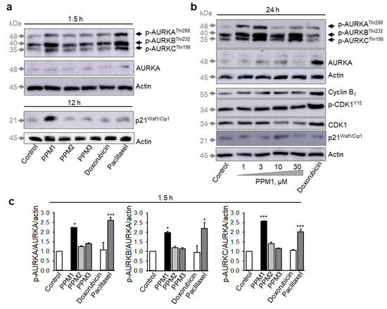 Already within 90 min of treatment, PPM1 and the mitotic poison paclitaxel, but neither doxorubicin, nor PPM2 or PPM3, induced a dramatic increase in the phospho-Aurora AT288/Aurora BT232/Aurora CT198 levels (Figure 3a). At a later point of time, PPM1 still induced an increase of the activity of Aurora kinases A/B/C with a maximum response after treatment with the subcytotoxic PPM1 concentrations, 1 and 3 µM, and a decline in the phosphorylation levels of Aurora kinases could be detected at cytotoxic PPM1 concentrations (Figure 3b). Doxorubicin had a little effect on the activity of Aurora kinases A/B/C, but treatment with doxorubicin profoundly increased the total level of Aurora kinase A (Figure 3b) apparently due to enhanced accumulation of cells in the S/G2 phase, which is characterized by high expression of Aurora kinase proteins [29]. Different to doxorubicin, treatment of MDA-MB-231 cells with PPM1 for 24 h showed no significant changes in the expression of cyclin B1 and CDK1, and relatively low CDK1 activation as evident from an inhibitory phosphorylation on Y15 (Figure 3b). In addition, the activation of Aurora kinases observed with a cytotoxic PPM1 concentration of 10 µM after 90 min treatment was normalized to about control levels 24 h later (Figure 3a,b). Next, we analyzed the effect of PPM1 on the expression of the cyclin-dependent kinase inhibitor 1, p21Waf1/Cip1.
