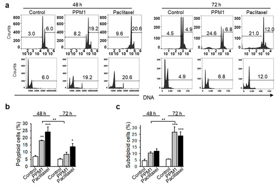 PPM1 induced formation of a polyploid cell population after 48 h of treatment (Figure 4a,b). The polyploid cell population, which was formed in PPM1-treated cells after 48 h, was significantly reduced in PPM1-treated cells after 72 h, whereas the apoptotic subG1 population increased (Figure 4a–c).