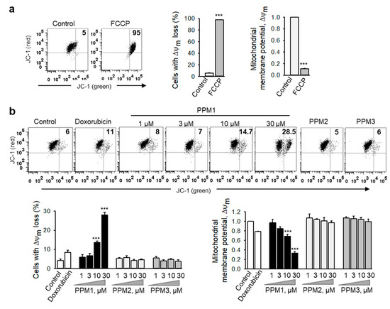PPM1 affects the mitochondrial integrity in breast cancer cells. (a) MDA-MB-231 cells treated with the respiratory uncoupler, FCCP (50 µM) for 6 h were used as positive control. (b) MDA-MB-231 cells were treated with doxorubicin (100 nM), different concentrations of PPM1, PPM2 or PPM3 (each at 30 µM) for 24 h. The mitochondrial membrane potential was analyzed flow cytometrically by using JC-1 dye. Representative dot plots are shown. Figures (upper right square) show number of cells with the loss of mitochondrial membrane potential (ΔΨm). ΔΨm was measured as red/green JC-1 fluorescence intensity ratio. Graphs demonstrate the percentages of MDA-MB-231 cells with depolarized mitochondria and the loss of ΔΨm in treated cells. Statistical analysis was performed by using the Newman-Keuls test. All data are mean ± SEM, n = 3, *** p < 0.001 vs. control.