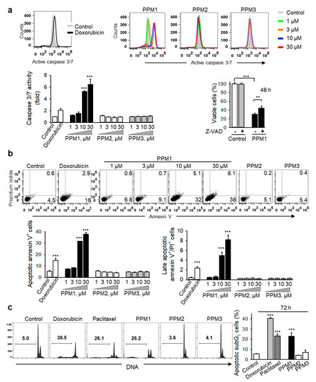 In the apoptotic signaling cascade, DNA fragmentation is a late caspase-dependent event and a universal biochemical hallmark of apoptosis [31]. Not surprisingly, treatment of MDA-MB-231 cells with PPM1 for 72 h increased the percentage of cells with subG1 DNA contents, similar to that of doxorubicin and paclitaxel, confirming induction of apoptotic cell death by PPM1 in the highly aggressive MDA-MB-231 breast cancer cells (Figure 6c). By contrast, neither PPM2- nor PPM3-treated cells exhibited any of above mentioned signs of apoptosis (Figure 6a–c).